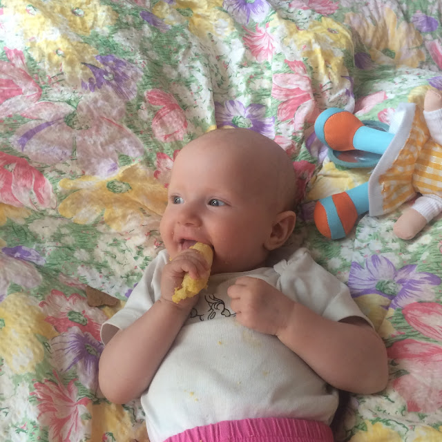 30. Na zdjęciu mamy Izabele moja cudowna 6 miesięczną córeczkę jedząc swojego pierwszego chrupka kukurydzianego.