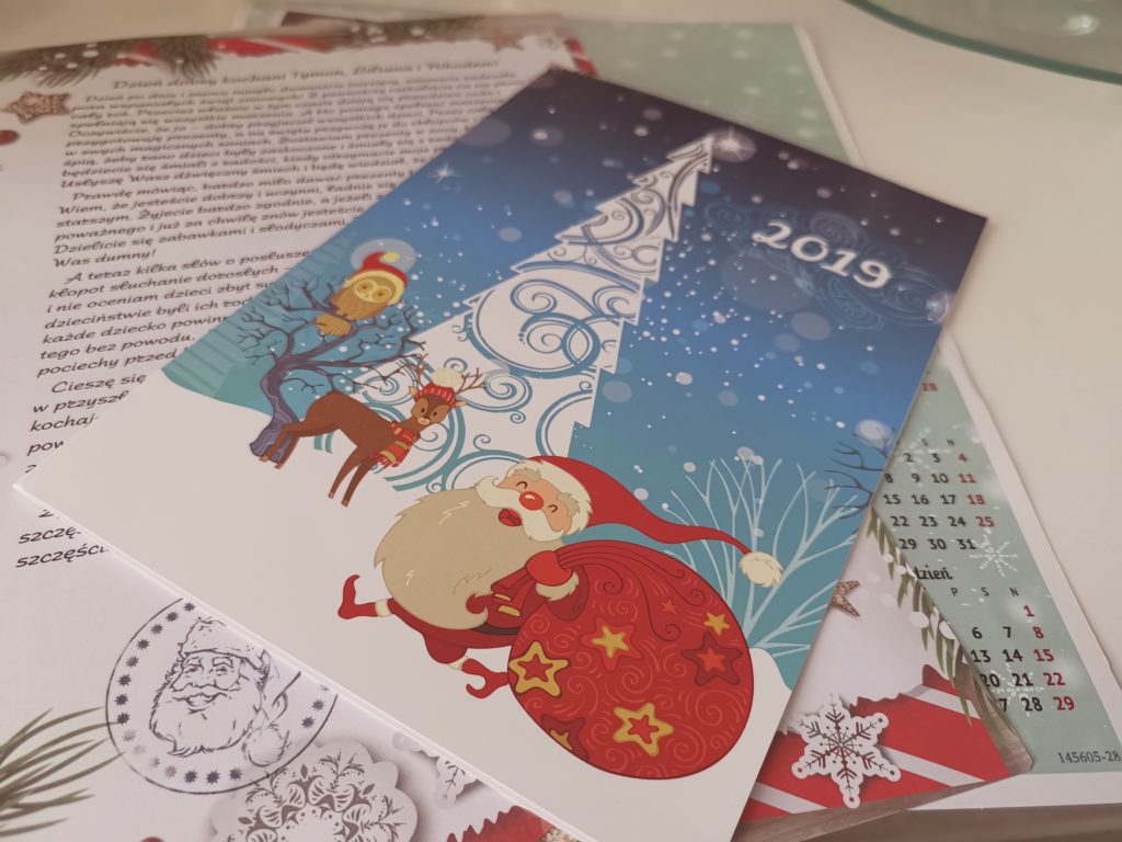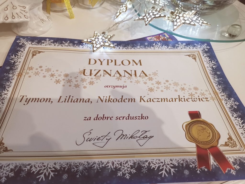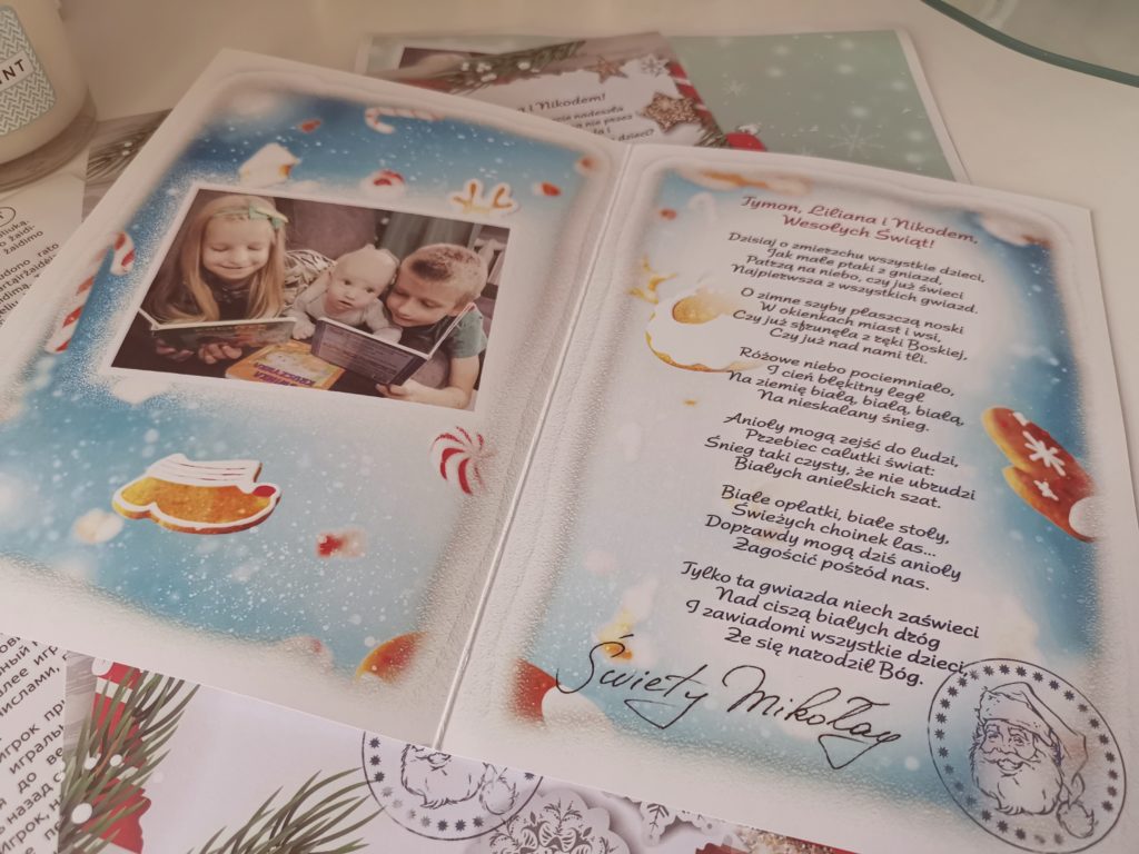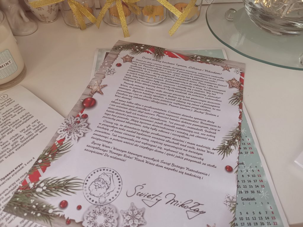 Tym razem było tak samo, ciasteczka czekały na Świętego, a dzieci nie mogły zasnąć wypatrując go ;P Rano zastały upragniony widok, zjedzone ciastka, upite mleko, brak laurki <3 I oczywiście prezenty. To jednak nie to je ucieszyło najbardziej . Ciut później tego dnia dotarła poczta od Samego Świętego Mikołaja. Po powrocie ze szkoły przedszkola oniemiały z zachwytu. Piękny list do całej trójki, kalendarz, płyta, Świąteczno-zimowa gra ;P oraz Dyplom zasługi za dobre uczynki <3 Dumni radośni chwalili się wszystkim gościom i wytykali że dorośli są niedowiarkami. A oni wierzą w Mikołaja i mają racje – Bo przecież do nich pisze.;)