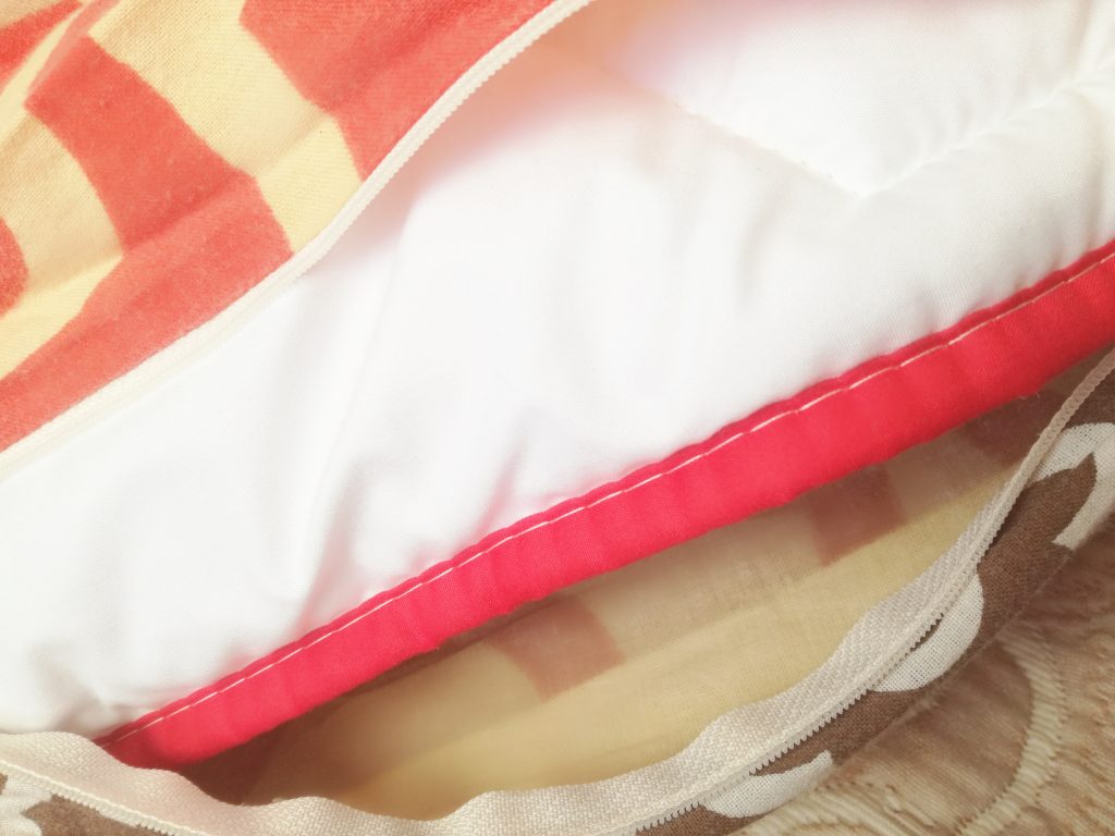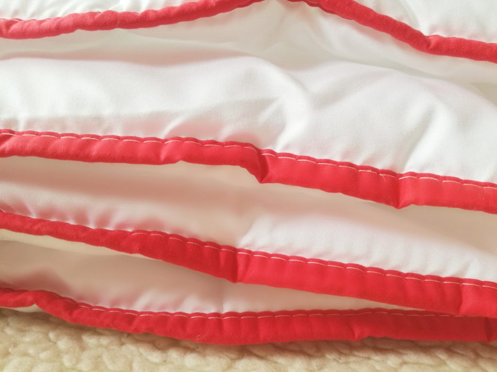 Jak widać, kołdra pięknie prezentuje się sama – bez zbędnych podszewek. Estetyka i jakość wykonania to profeska i nie można tu nic zarzucić. Czerwona lamówka to element kojarzący się z ciepłem i dodający elegancji. Kołdra jest pikowana nietypowym wzorem. Cudna, jednak nadal biała, a co za tym idzie podatna na zabrudzenia, więc dla bezpieczeństwa założyłam na nią poszwę. To nie zmienia jej właściwości wcale a wcale. Łatwiej jest wyprać poszewkę niż całą kołdrę. Choć i ją również można bez problemu prać:) Teraz czas zainwestować w poduchy. Kołdry i poduchy mamy w dwóch rozmiarach – KOŁDRY – 155×200 oraz 220×200, zaś PODUCHY – 50×60 oraz 70×80 🙂 Czyli standardowe rozmiary. Kołdra, którą ja testuję, to ta mniejsza;)