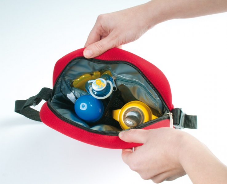 - Wewnątrz: kieszeń z siatki utrzymująca butelkę/kubek w stałym miejscu oraz kieszeń na suwak na pieluszki lub mokre chusteczki